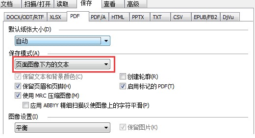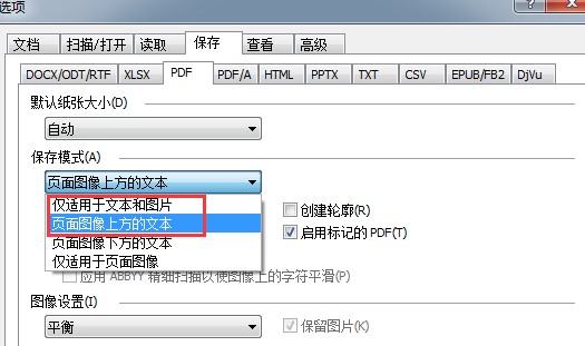 3、在保存模式下面,选择‘页面图像上方的文本’或者‘仅适用于文本和图片’;