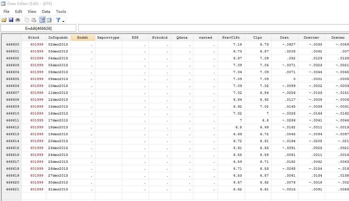 合并前:Stkcd、Infopubdt、Enddt、Reporttype、EPS、Stkcdid、Qdate、wanted(一共28988行数据)