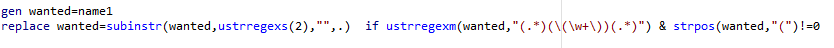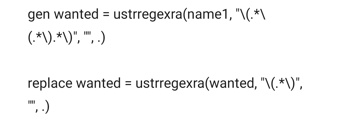 silas_x 发表于 2021-12-6 08:46 gen wanted = ustrregexra(name1, \"\\(.*\\(.*\\).*\\)\", \"\", .) replace wanted = ustrregexra(want ...