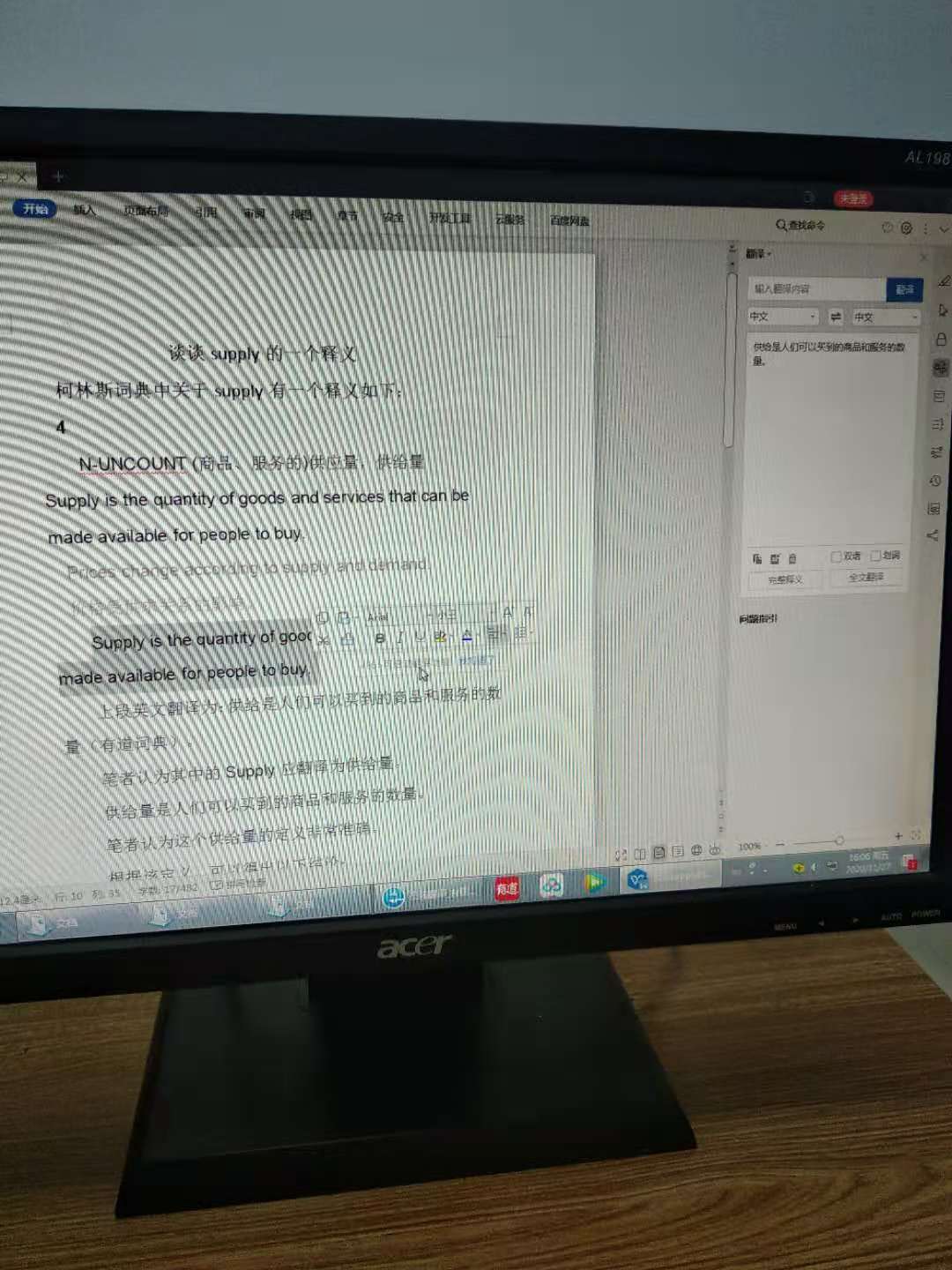 上段英文翻译为:供给是人们可以买到的商品和服务的数量(有道词典)。