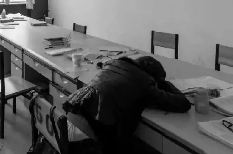 办公室里,一位老师深夜孩子批改学生作业,太累了,先趴桌子休息一会儿,等会还得继续工作。