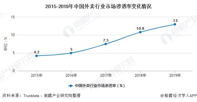 伴随着外卖服务市场的迅速发展,外卖行业交易额占全国餐饮收入比重逐年提升,截至2019年底,中国外卖行业市场渗透率达13%,比2018年底提升2.2个百分点。