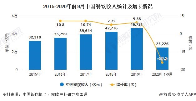 行业监管加强另一方面也促进行业规范发展。据中国饭店协会,2019年,全国餐饮收入为46721亿元,同比增长9.4%,高于2018年的7.75%。2020年由于疫情原因,1-9月中国餐饮收入达到25226亿元,累计下降23.9%,降幅逐步缩小,其中,限额以上单位餐饮收入5465亿元,同比下降20.8%。