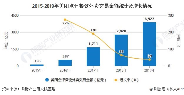 以美团点评为例,2015-2019年美团点评餐饮外卖交易金额不断增长,2019年达到3927亿元,同比增长39%。