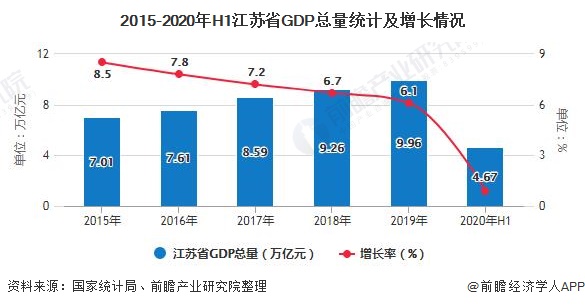 从经济总量上来看,2015-2020年上半年,在全国范围内江苏省GDP排名持续保持在第二位,仅次于广东省,2019年达到9.96万亿元,2020年上半年GDP达到4.67万亿元,同比增长0.9%,高于全国2.5个百分点,并且在全国GDP前五省份中,增速排列第一。江苏省庞大的经济总量为物流园区的发展提供良好的经济基础。