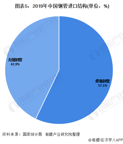 2019年钢管进口量为32.4万吨,同比下降39%,钢管进口4年首次出现下降。钢管进口量在钢材进口总量中的占比为3%左右。在2019年钢管进口中,无缝钢管进口13.9万吨,焊接钢管进口18.5万吨,无缝钢管和焊管进口量均出现下降。