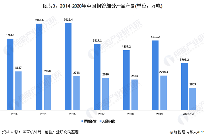 2019年,在钢管产量中,焊接钢管产量5619.2万吨,同比增长10.9%,无缝钢管产量2798.4万吨,同比增长4.6%。