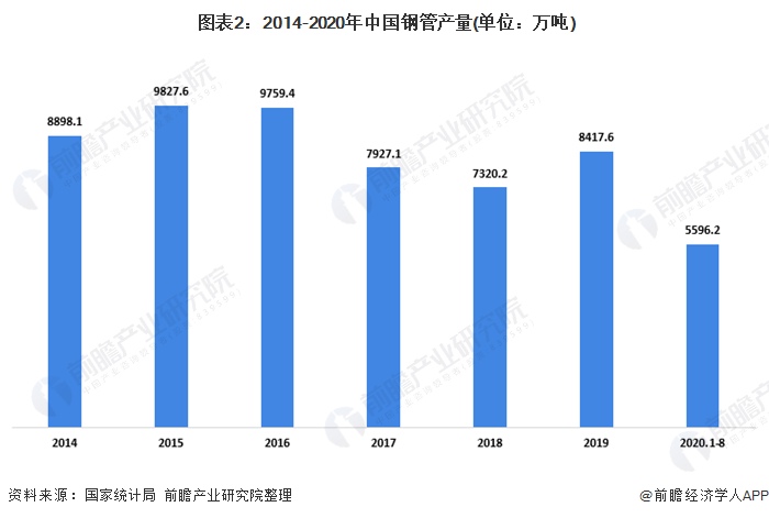 根据国家统计局统计显示,2019年我国钢管产量为8417.6万吨,同比增长8.7%。2020年1-8月,我国钢管累计产量5596.2万吨。