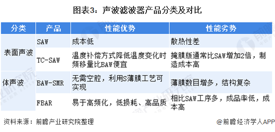 滤波器根据实现方式的不同可以分为LC滤波器、腔体滤波器、声学滤波器、介质滤波器等。不同滤波器适用于不同的应用场景,在手机无线通信应用中,由于设备尺寸较小、功率较低,因此目前智能手机使用小体积高性能的声学滤波器,根据结构不同可以分为声表面波(SAW)滤波器和体声波(BAW)滤波器。