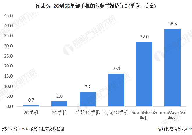 据Yole预测,2020年单台高端4G手机的射频前端芯片价值量高达16.35美金,而Sub-6Ghz 5G手机和mmWave5G手机价值则为32美元和38.5美金。