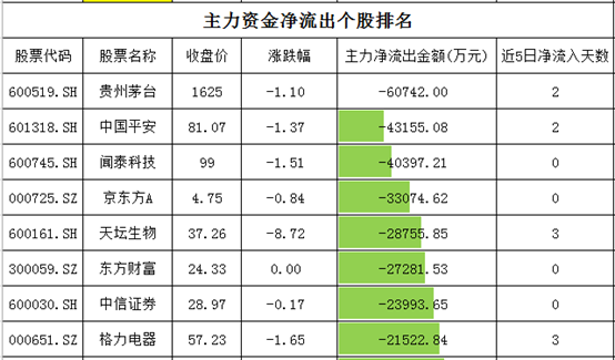 个股资金净流出方面,贵州茅台净流出超过6亿元,中国平安、闻泰科技净流出在4-4.4亿元,京东方A净流出超过3.3亿元。