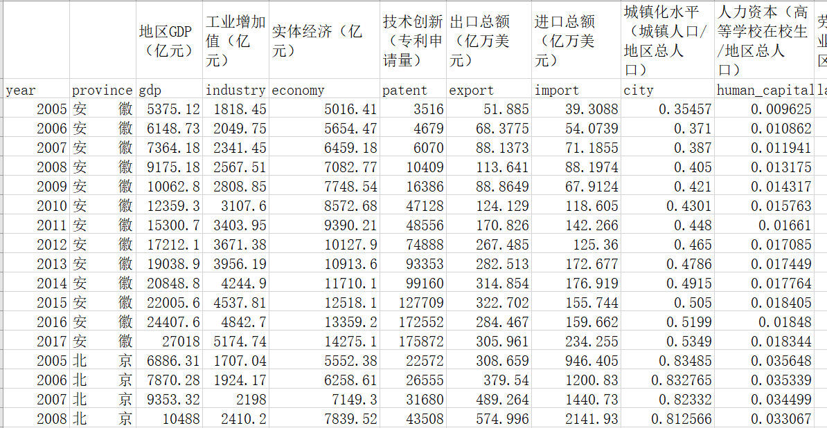 中国统计年鉴各省份2005-2017年各个常用变量整理