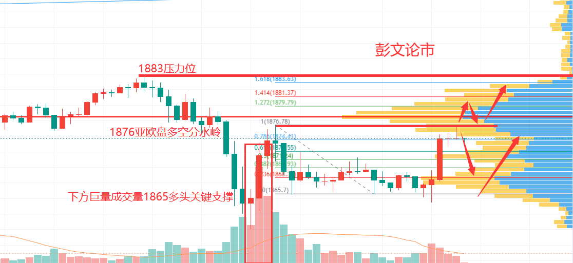 上方,昨日反转压制点1876.5位置,在昨日美盘后半段行情,没有更多的成交量支撑多头,价格调整回落,1876.5为日内多空分水岭,多头站上这一点位将继续上看1883;不破亚欧盘先看1865-1875区间震荡。