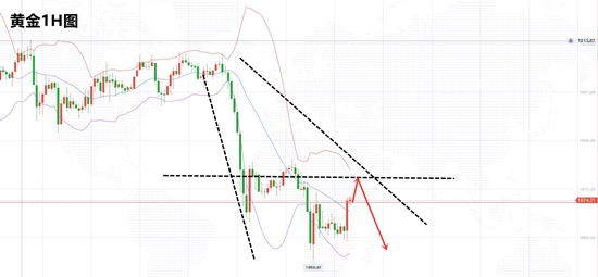 黄金日K线连续两日连阴,MACD在零轴下方死叉向下,说明整体价格处于弱势中。尽管从隔夜美盘开始价格在低位陷入震荡修正,但是整体的空头态势并未发生改变。只是大幅下跌后的低位震荡修正。所以整体空头思路仍然不变。根据笔者策略在1878区域参与空头者继续持有,未参与者等待价格再次反弹接近该位置参与空头。