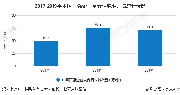 据中国调味品协会数据显示,近年来,我国百强企业复合调味料产业生产总量总体波动较大,2019年我国百强企业复合调味料产业生产总量为71.1万吨。