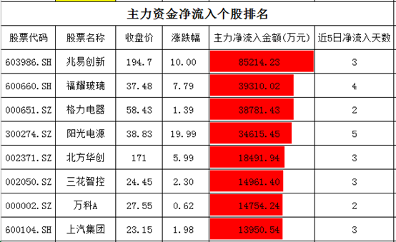 个股资金净流入方面,五粮液净流入超过9.2亿元,华友钴业、智飞生物净流入在4.2-7亿元,美的集团、金风科技和泸州老窖净流入在3.1-3.8亿元。