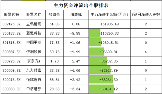个股资金净流出方面,中兴通讯、中国平安净流出在4.9-5.8亿元,君正集团、万华化学净流出在3-3.5亿元。