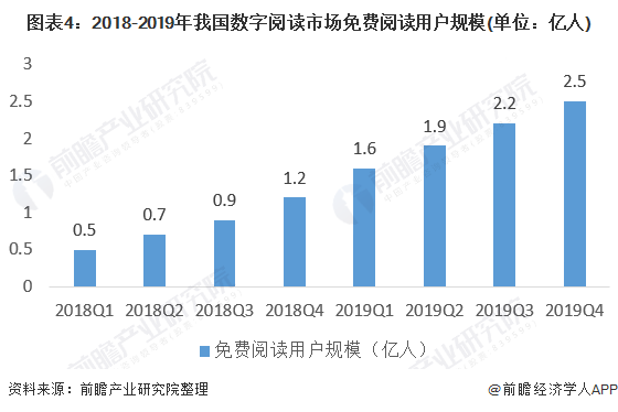 免费阅读模式的兴起开拓了数字阅读以广告为主要的变现方式。自2018年米读小说、爱奇艺读书等平台推出免费网文模式后,免费阅读模式迅速发展壮大。我国数字阅读市场中免费阅读用户规模从2018年的0.5亿人上升至2019年的2.5亿人。