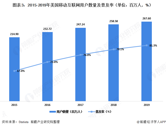 随着宏观经济整体向好,美国互联网及移动互联网行业都迎来了新增长,据Statista数据显示,2019年美国移动互联网用户为2.676亿人,移动互联网普及率达到81.3%。