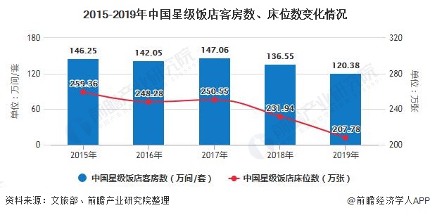 从星级饭店的客房数和床位数来看,2015-2019年,随着星级饭店数量的总体减少,客房数和床位数也呈下降趋势。2019年,全国星级饭店客房数为120.38万间/套,床位数为207.78万张。