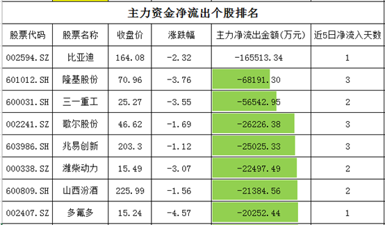 个股资金净流出方面,比亚迪净流出超过16.5亿元,隆基股份、三一重工净流出在5.6-6.9亿元.