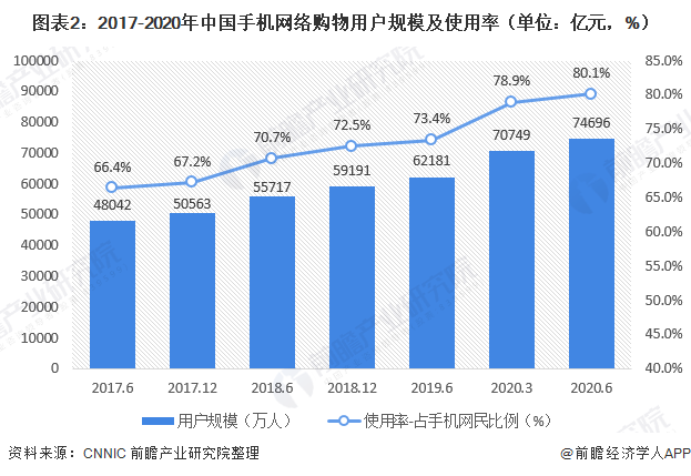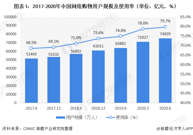 截至2020年6月,我国网络购物用户规模达7.49亿,较2020年3月增长3912万,占网民整体的79.7%;手机网络购物用户规模达7.47亿,较2020年3月增长3947万,占手机网民的80.1%。