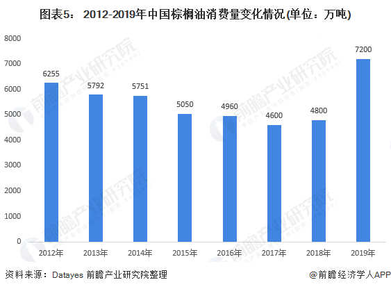 我国棕榈油消费量变化情况与供给变化情况近似,2012-2019年呈现先下降后增长的态势。近年来,棕榈油在我国的食品加工业中逐渐得到了广泛的应用,2019年,我国棕榈油消费量突破7000万吨。