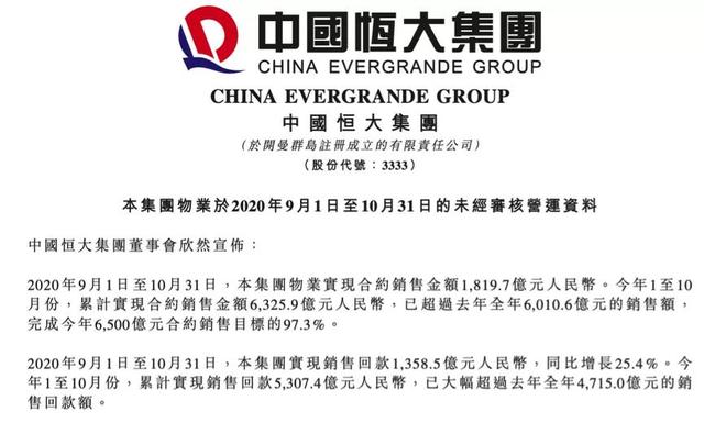 根据恒大公布的最新未经审核营运数据,今年10月份当月,恒大实现合约销售额1819.7亿,整个1-10月份,则实现合约销售额6325.9亿元,超过去年全年的6010.6亿销售额,完成今年6500亿销售目标的97.3%。
