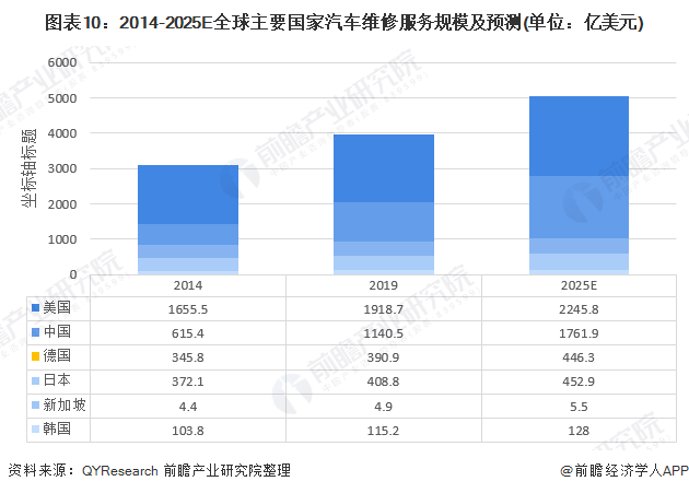 根据全球细分行业调查的领导者QYResearch的数据,全球汽车维修服务规模由2014年的5619.2亿美元上升到2019年的6973.9亿美元,伴随着汽车保有量的持续上升、车龄老化趋势以及消费升级和服务价格上涨,全球汽车维修服务规模未来仍会保持继续增长态势,预计到2025年达8660.6亿美元,年复合增长率(CAGR)达3.68%,未来增长潜力巨大。