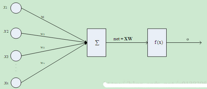 可以看到输出的o = f(w1x1+w2x2+w3x3+w4x4) = f(∑WiXi)。