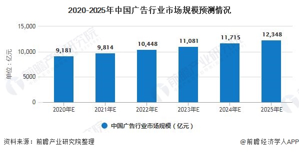 前瞻产业研究院预计,从整个广告行业的发展趋势来看,未来几六年,仍将保持较平稳的增速,2020-2025年复合增长率保持在6%左右。预计2020年全年,广告行业市场规模将接近9200亿元,随后逐年稳步增长,到2022年,广告行业市场规模有望突破1万亿元。