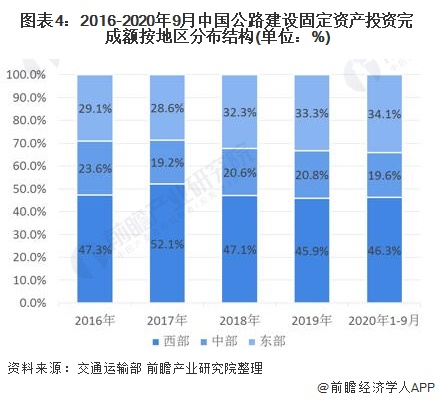 从区域公路建设投资情况来看,据交通运输部统计数据显示,2016-2020年9月中国西部地区公路建设投资完成额最大,占比保持在45%-55%之间,2020年1-9月,我国西部地区公路建设固定资产投资完成额为8236亿元,占总投资额的46.3%;中部地区公路交通固定资产投资完成额为3494亿元,占总投资额的19.6%;东部地区公路交通固定资产投资完成额为6059亿元,占总投资额的34.1%。反映出目前基础设施建设相对薄弱的西部地区仍是我国公路建设投资重点发展地区。