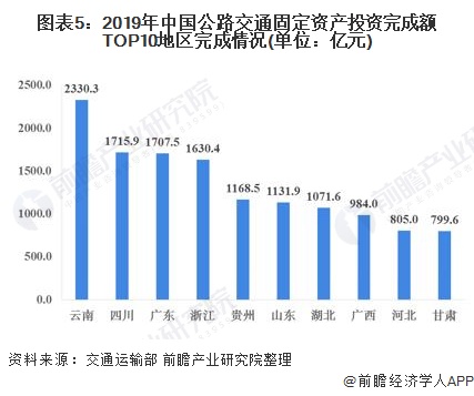 从各省(直辖市)公路交通固定资产投资完成额排名情况来看,2019年,云南省公路交通固定资产投资完成额位居全国首位,全年投资完成额为2330.3亿元;四川及广东紧随其后,投资完成额分别为1715.9亿元和1707.5亿元。