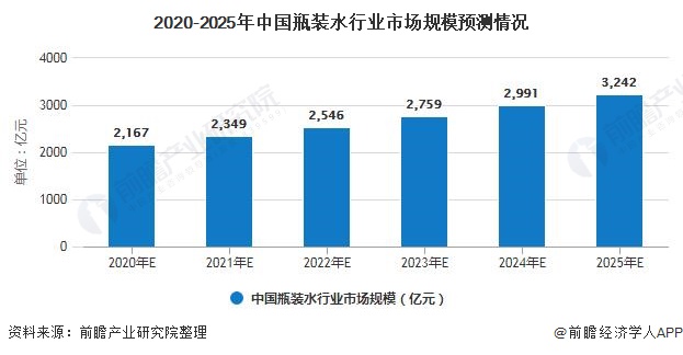 中国软饮料消费群体已经逐渐从碳酸饮料过渡到瓶装水;瓶装水细分市场所占份额不断提高,其他细分市场,如碳酸饮料市场则进一步被蚕食。随着整个现代社会工作、生活节奏的加快,生活水平的提高,消费者更加生活品质和生活满足感的提升,对食品消费健康的重视程度会越来越高,人们对瓶装用水的消费量也将在未来几年持续稳定地增长。前瞻预计,未来几年中国瓶装水市场规模将以8%-9%的增速增长,2025年市场规模有望突破3000亿元。