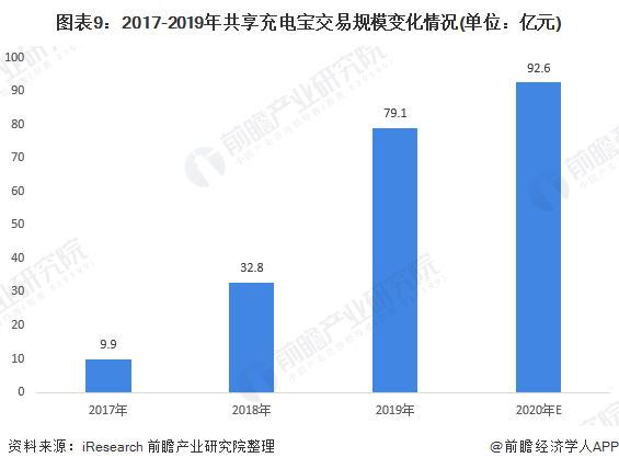 共享充电宝即移动电源自助租赁服务。近年来,大量企业布局共享充电宝行业,共享充电宝产品快速渗透。2017-2019年,共享充电宝交易规模逐年增长。2019年,共享充电宝交易规模实现约79.1亿元,行业增速达到141.15%。2020年其市场规模预计将超过90亿元。