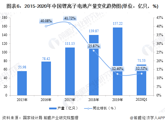 我国移动电芯的生产能力十分强劲,以18650电芯即锂离子电池为例,2015-2019年其产量不断增长。2019年,我国锂离子电池产量157.22亿只,同比增长12.40%。2020年上半年,在新冠疫情的影响下,我国锂离子电池仍然实现了71.53亿只的高额产量,较2019年同期增长12.52%。