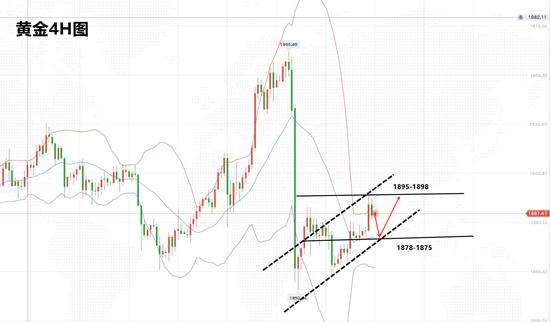 黄金周五在1880位置震荡了一天,晚间迎来爆发,大阳线直接拉升,空头直接被扼杀,黄金大阳线拉上,直接打破震荡格局,多头强势拉升,当前短线依然是反弹走势,并且站稳在1880上方,我们还是维持看涨思路不变!短线上方目标首先看1895!破位顺势跟紧。四小时k线顶破震荡已久的区间,大阳线直接越过,k线直接从布林带中轨发力,直接来到上轨,同时布林带轨道向上倾斜明显,强势扭转成向上,开口向上继续加大,50均线支撑k线上扬,直接托起k线上涨,多头明显格局。现在的黄金走势相对简单,自1860位置开始反弹,单边小涨的走势,虽然短线有窄幅波动,但是方向比较确定,短线看涨!上方第一目标先看1895位置,如果突破1895黄金还能继续看高点,首看1900关口,破位看1930。那么下周操作上白灵雁建议回调做多为主,高空为辅。短线下方关注1878-1875一线支撑。上方阻力关注1895-1898一线。