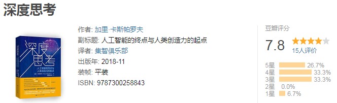 - 推荐理由:本书以全新的角度来看待和理解人工智能,作者卡斯帕罗夫用他无与伦比的经验审视了智能机器的未来,并预见到它的可能性,一本被书名耽误的好书。
