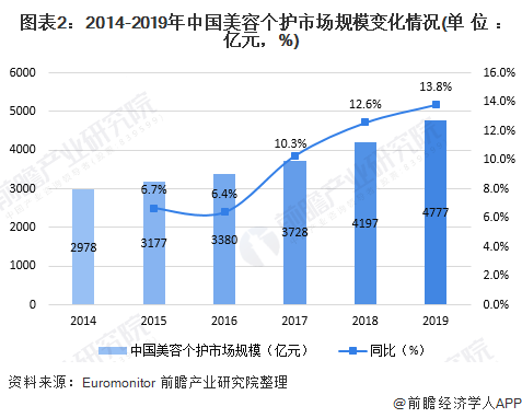 美容个护市场在颜值经济的推动下快速发展,市场规模加速上升,根据Euromonitor公布的数据显示,2019年我国美容个护市场规模达4777亿元,同比增长13.8%。