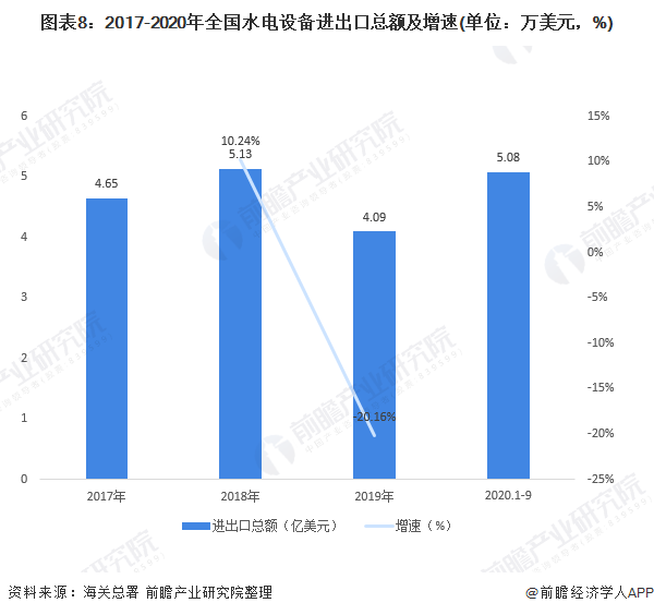 整体而言,我国水电设备进出口市场波动较大,但处于贸易顺差状态。随着中美、中英、中印等中外矛盾升级,一些国外企业取消中企订单,我国水电设备产品出口受到一定影响,导致水电设备产品贸易顺差额下降幅度较大。2020年我国加快发展壮大水电清洁能源,水电大机组设备陆续生产完成,并且在技术产品等方面不断突破,水电设备出口结构也不断升级。