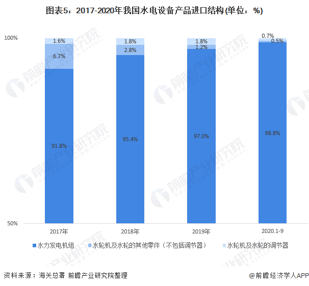 进口方面,我国水电设备主要进口水力发电机组,多年来,我国水力发电机组进口额占比均在90%以上,并逐渐上升。2019年进口金额为1.16亿美元,占比达到98.8%。