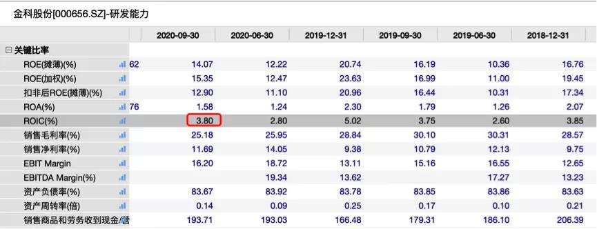 根据万得数据,在用以反映上市公司投资回报率的ROIC指标上,金科股份仅2019年达到5%的行业平均水平,今年三季度则只有3.8%。