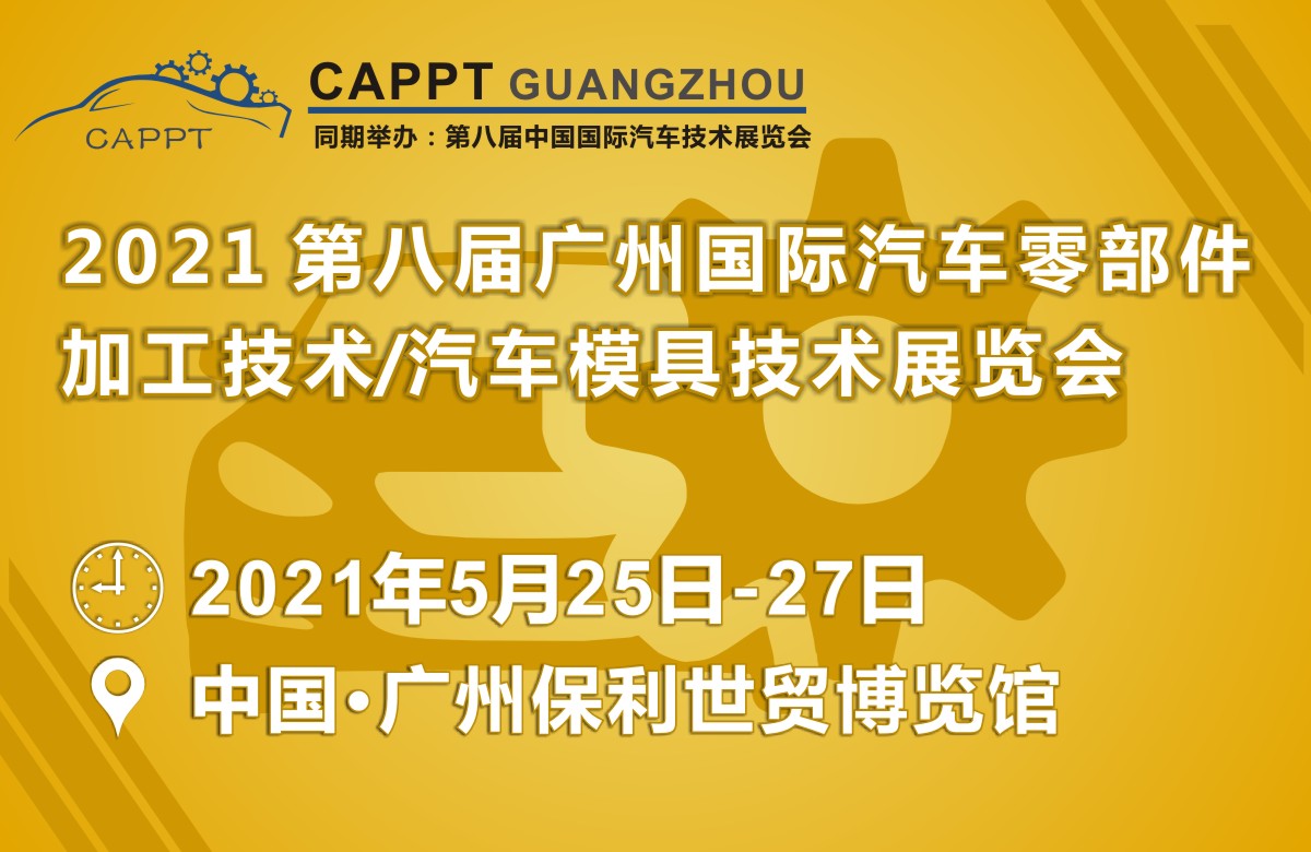 由沃森展览等单位联合主办的第八届2021 中国(广州)国际汽车零部件加工技术/汽车模具技术展览会 (简称CAPPT) 将于2021年5月25日-27日在广州保利世贸博览馆盛大举办。CAPPT展分为三大展区:汽车零部件成品展区、汽车零部件加工设备展区和汽车模具展区,旨在帮助企业拓展大粤湾发达的汽车产业。大粤湾两广地区是中国汽车产业最聚集的地区之一,市场潜力巨大;参加 CAPPT 2021,可以帮助您与华南80多家主机厂以及3000家以上的汽车零部件制造商面对面沟通,需求合作机会,拓展销路。