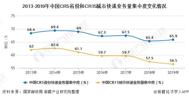 从国内主要省份和城市快递业务量行业集中度来看,2013-2019年期间,快递业务量前五省份的行业集中度CR5从68.4%降到65.9%,而快递业务量前十五城市的行业集中度CR15东62.0%降到56.5%,反映出快递行业逐渐向下沉市场转移趋势明显。。