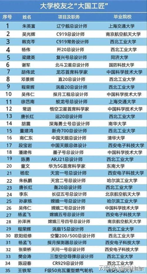 2020年中国35位“大国工匠”名单出炉:西北工业大学占据半壁江山,