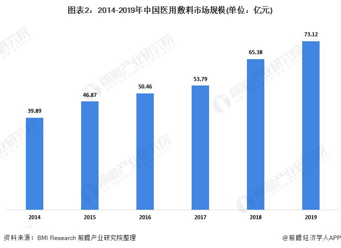 近年来,我国医疗资源逐渐丰富,医疗保障力度逐渐加大,基础医疗设施建设加快,居民生活水平及健康意识不断提高,医用敷料市场亦随之迎来快速发展时期。2014-2019年,我国医用敷料市场规模由39.89亿元增长至73.12亿元。