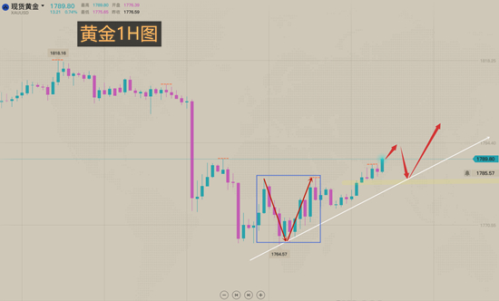 黄金突破1788阻力,空头下跌告一段落,黄金正式开启波段反弹走势,昨日的三次跌不破,今日的慢涨,无一不是表明了多头反弹的强势。接下来我们将改变此前高空的思路,转为低多策略,接下来关注1800位置的压力,突破后可能会再次回到1800-1820的震荡区间内。