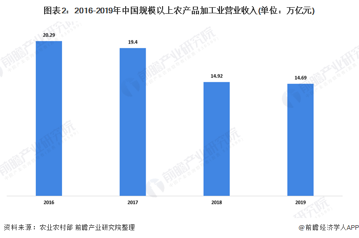 2019年,面对经济下行压力加大、工业企业利润持续负增长以及国际贸易环境不确定性上升的外部形势,农产品加工业总体保持缓中趋稳、稳中有进态势,供需保持较快增长,产业结构持续优化,新业态新模式蓬勃发展,为国民经济稳增长和促进乡村产业振兴做出了重要贡献。总体来看,2019年规模以上农产品加工业完成营业收入14.69万亿元,同比增长2.1%。