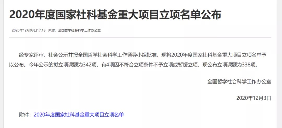 2020年12月03下午17点,全国哲学社会科学工作办公室官方网站发布公告,正式公布了本年度的国家社科基金重大项目的立项名单,共有338项获得立项。该名单公示时共有342项,有4项因不符合立项条件不予立项或暂缓立项。