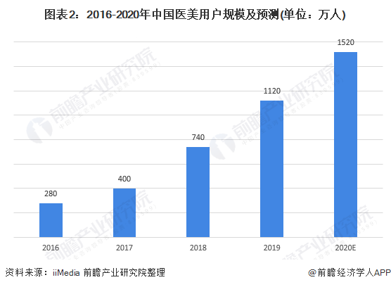 从用户规模来看,2019年中国医美市场用户规模达到1120万人,预计2020年将达到1520万人。2020上半年,受新冠疫情影响,行业到店服务客户明显减少。但随着疫情逐步好转恢复,行业有望在2020下半年迎来报复性反弹,医美行业将持续保持稳步发展态势。